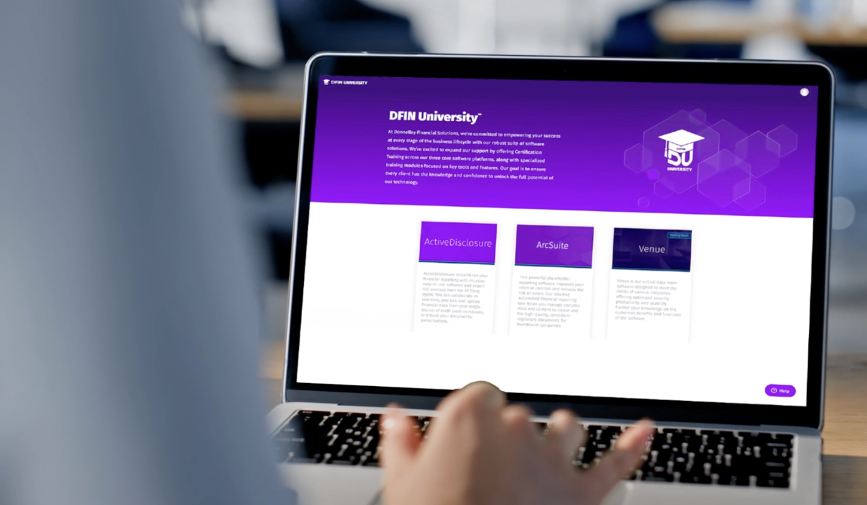 DFIN University is currently available with ActiveDisclosure and Arc Suite content. Venue content coming soon.