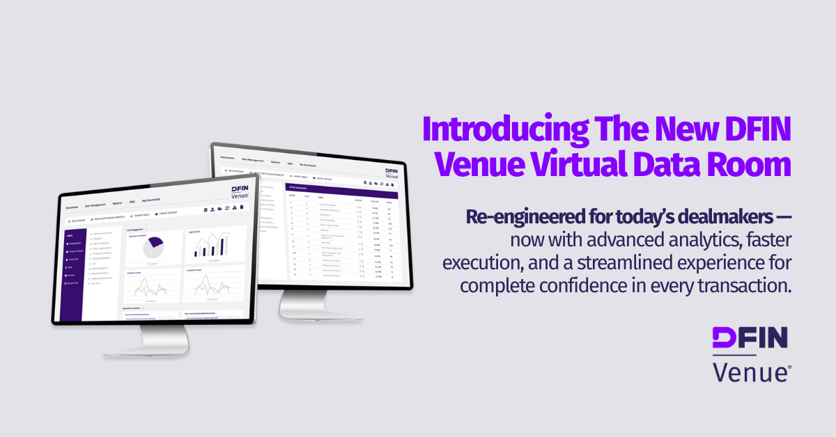 Share on LinkedIn Share on Twitter Share on Facebook M&A in 2026: What’s Powering Deals and Why Venue VDR Leads the Way Share on LinkedIn Share on Twitter Share on Facebook Industry leaders recently joined Nasdaq TradeTalks to share how organisations are adapting to a rapidly changing deal environment—what’s powering the next wave of M&A in 2026, the impact of regulation and tariffs, and the practical strategies companies are using to stay competitive. Jill Malandrino hosted an expert panel featuring:Keith Pinder, CEO of Landon CapitalMike Patrone, Partner, Technology & Life Sciences at GoodwinFrancisco Morales Barron, Partner – M&A and Private Equity at Vinson & ElkinsDaniel Friedman, Global Leader of Transactions & Integrations at BCG ▶ Watch the full Nasdaq TradeTalks replay Key M&A Trends Shaping 2026Strategic Adaptation: Companies are adjusting deal structures to manage regulatory scrutiny, tariffs, and geopolitical uncertainty. Sector Focus: Technology and life sciences dealmaking remain dominant, driven by innovation and digital transformation.Regulatory Impact: Compliance requirements are influencing timelines and due diligence processes.Integration & Value Creation: Post-merger integration and synergy realisation are critical for long-term success.Regionalisation: A shift toward regional deals to mitigate cross-border risks and complexity.Data-Driven Decisions: Advanced analytics and AI tools are increasingly used for target evaluation and integration planning.Dealmaking in 2026 with DFIN Venue® VDR: What Sets Us ApartFrom sell‑side due diligence to IPOs, fundraising and cross‑border M&A, DFIN Venue® Virtual Data Room (VDR) delivers the advanced features and insights today’s dealmakers need to execute deals quickly, securely and with confidence. Here are the key product enhancements in 2026 that set us apart from other virtual data room providers: Purpose‑built for Modern DealmakingWorkflows built-in to manage competitive sell‑side processes with confidenceCoordinate cross-border and regional diligence across multiple bidders efficientlyAccelerate timelines to close with clean executionEnhanced analytics to guide outreach and prioritise follow‑upsDFIN Backs Your Deal with 24/7 Expert SupportDedicated project experts at every stageTraining and onboarding for project teams and usersLive Chat—immediate assistance whenever and wherever you need itVenue® Checks Every Box for Your DealsTop‑tier, enterprise‑grade securityDeal‑centric workflows and user experiencePricing transparencyGlobal and industry‑specific compliance (GDPR, HIPAA, ISO/IEC 27001:2013)Looking for a practical checklist on selecting the right VDR for M&A? Read more here: How to Choose the Right Virtual Data Room Provider Learn more about our new Venue Virtual Data Room, or speak with our capital markets specialists across APAC, EMEA, or North America to see how Venue can support your next M&A deal in 2026 and beyond. Related Products and Solutions Knowledge Hub Page (Insight) Venue® Maintain control. Stay protected. Learn More