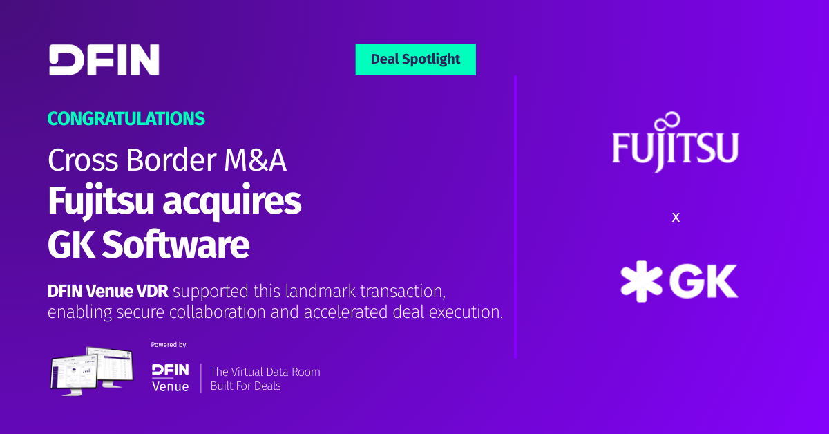 Share on LinkedIn Share on Twitter Share on Facebook Fujitsu Acquires GK Software – Powered by DFIN Venue Share on LinkedIn Share on Twitter Share on Facebook Fujitsu Limited, a leading global technology company headquartered in Japan, announced on 27 May 2025 the successful completion of its acquisition of GK Software, a Germany‑based retail technology leader, in a public takeover valued at approximately €432 million.Following completion, GK Software becomes a wholly owned subsidiary of the Fujitsu Group. The transaction brings together Fujitsu’s global technology capabilities with GK’s market‑leading retail software, which currently serves more than a quarter of the world’s top 50 retailers across 60 countries.The acquisition strengthens Fujitsu’s strategic growth under Fujitsu Uvance, enhancing its Consumer Experience offering through GK’s industry‑leading POS and SaaS solutions, including AI‑powered price optimisation. Continuity in leadership is maintained, with GK’s existing management team remaining in place to support the next phase of growth.How DFIN Venue Supported the TransactionCross‑border public M&A transactions demand the highest standards of security, governance, and execution — particularly where buy‑side and sell‑side teams operate across multiple jurisdictions and regulatory environments.DFIN Venue Virtual Data Room (VDR) supported the Fujitsu–GK Software transaction by delivering:Secure document sharing between Japanese and European stakeholdersControlled access and advanced permissioning for sensitive commercial and regulatory informationReal‑time collaboration between corporate, legal, and financial advisorsRobust audit trails and reporting to support public takeover due diligence and executionDFIN Venue continues to be the trusted virtual data room for complex, cross‑border technology transactions worldwide.Learn more about DFIN Venue Virtual Data Rooms for M&A:https://www.dfinsolutions.com/en-gb/products/venue Related Products and Solutions Knowledge Hub Page (Insight) Venue® Maintain control. Stay protected. Learn More Knowledge Hub Page (Insight) Mergers and Acquisitions Access expertise. Simplify your deal. Learn More Related Content Knowledge Resources How to Choose the Right Virtual Data Room Provider for Global M&A, Fundraising and More   Knowledge Resources Cross-Border M&A in Life Sciences: What Dealmakers Need to Know About Data & Compliance   Blog Gojob’s Strategic Leap to Japan – Powered by DFIN Venue