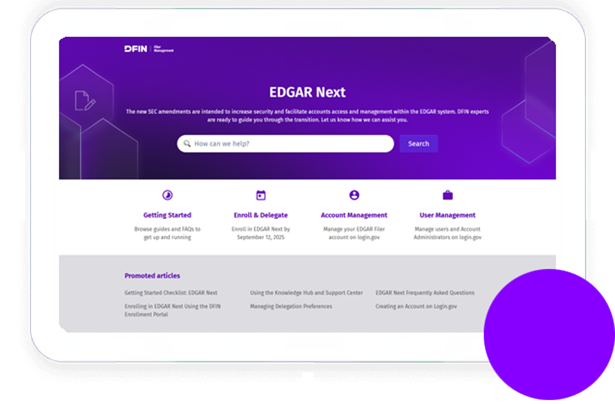 EDGAR Next compliance began on September 15, 2025. EDGAR Next Enrollment closed on December 19, 2025. If you did not enroll a CIK by December 19, 2025, an application for EDGAR access (Form ID) is required to regain access to the EDGAR account of the CIK. DFIN can assist with Form ID processing. Don't miss a filing, delegate to DFINs Filing Agent CIKs. Working with DFIN means you'll gain the expertise and support needed to comply with EDGAR Next. We're here to help.